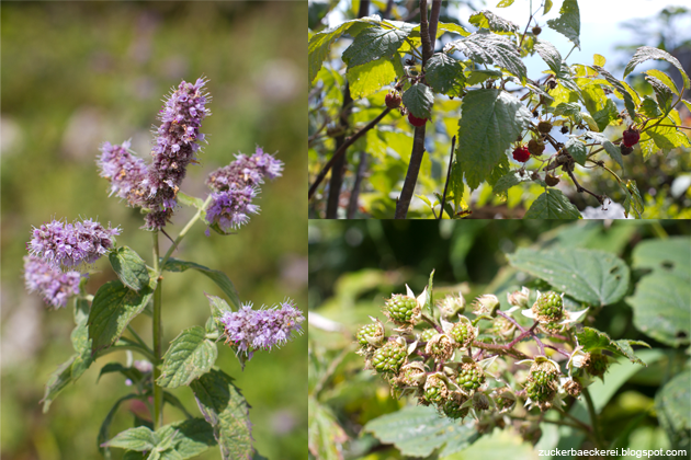 Überall wilde Minze! Außerdem Himbeeren und leider noch nicht reife Brombeeren.
