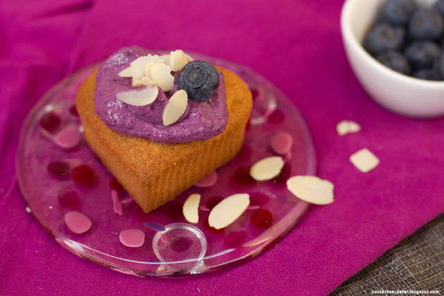 Weil ich für eine Mitschülerin, die sich erbarmt hatte, den schimmelnden Kühlschrank in unserem Q-Zimmer (der Aufenthaltsraum für die Schüler der Qualifikationsphase = Oberstufe) blitzeblank zu putzen, einen Dankeschönkuchen backen wollte, durchforstete ich einmal wieder mein Backbuchregal. Die unendlichen Weiten dessen erstrecken sich zwar nicht ganz so weit wie die meines Nachbacklisten-Tumblrs und Foodgawker, es dauerte trotzdem eine ganze Weile bis ich mehr oder weniger fündig wurde. Ein Alle-Zutaten-im-Haus-Rezept kam mir leider in keinem Buch unter, so wurden es Cupcakes in sehr entfernter Anlehnung an ein Rezept aus Cupcakes vom GU-Verlag. Eindeutig der beste Teil am Rezept: Das Heidelbeerfrosting. Schon immer wollte ich mal lila Frosting machen, aber nie bin ich auf die Idee gekommen, statt Lebensmittelfarbe, die es nirgends gibt, einfach mal pürierte Beeren zu nehmen…