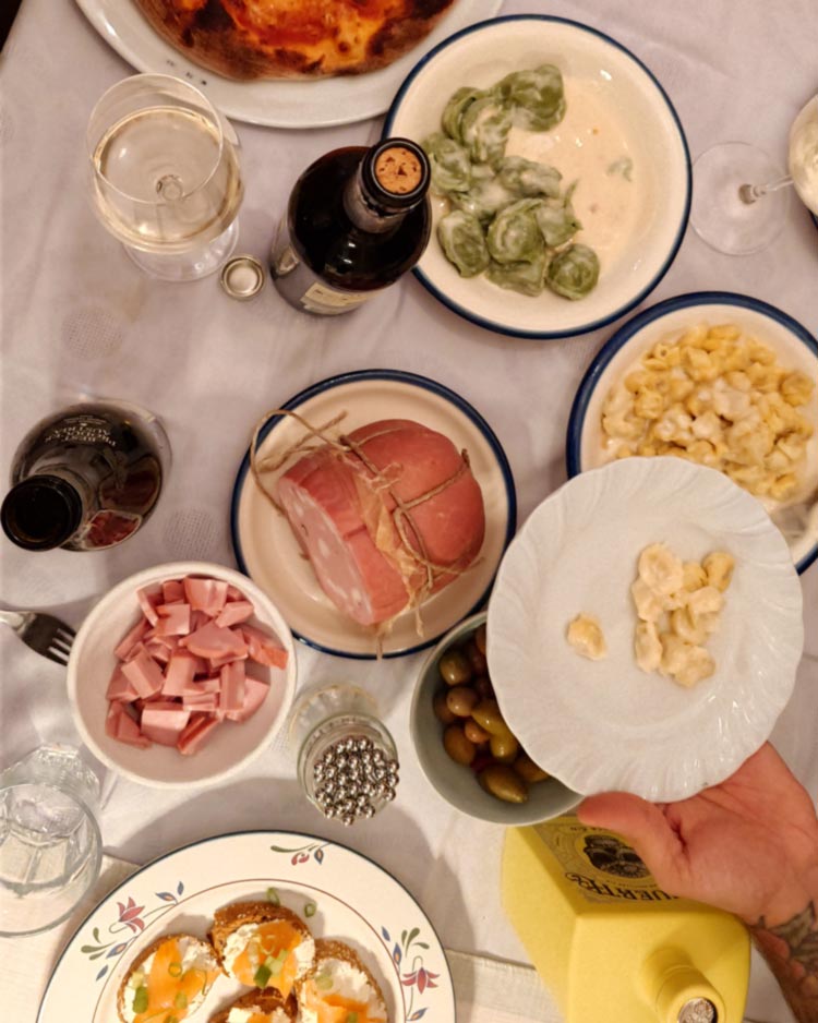 Ein italienisches Festmahl mit Antipasti, Tortellini und Pizza von meinem Mitbewohner. Panierte gebackene Schwammerl (Rotkappen und Pfifferlinge, die mein Vater gefunden hatte) mit Kräuter-Sauerrahm. Zwetschgen-Knödel. Fritatten-Suppe. Ofengemüse mit Hummus. Spaghetti mit Karfiol und Champignons. Erdnusseintopf mit Süßkartoffeln nach immer schon vegan von Katharina Seiser.