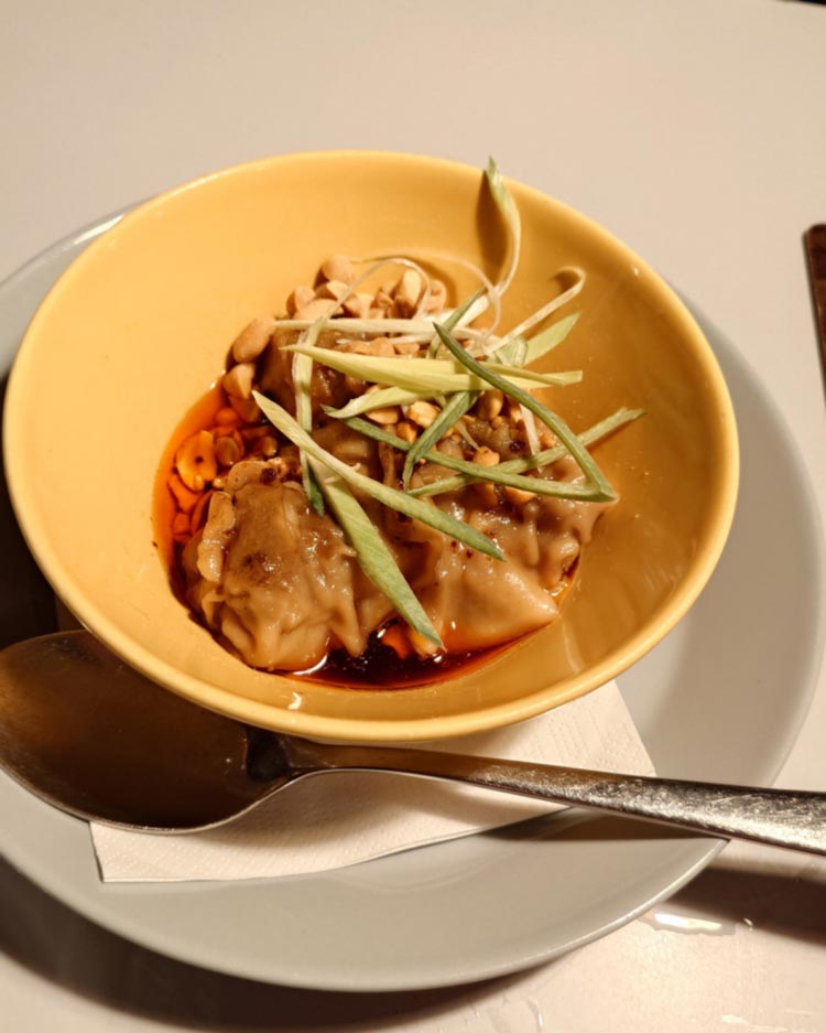 Auch die Vorspeise – Wan Tan (9€) mit Schweinsschopf-Füllung, gerösteten Erdnüssen, Jungzwiebeln und Chiliöl – war sehr gut. Das Ambiente ist dabei übrigens klassisch-österreichisch. Die alte Gaststube wurde nur mit ein paar Design-Details (Öffi-Sitz-Muster auf den Bänken, Musselin-Servietten, fancy minimalistische Lampenschirme) aktualisiert.
