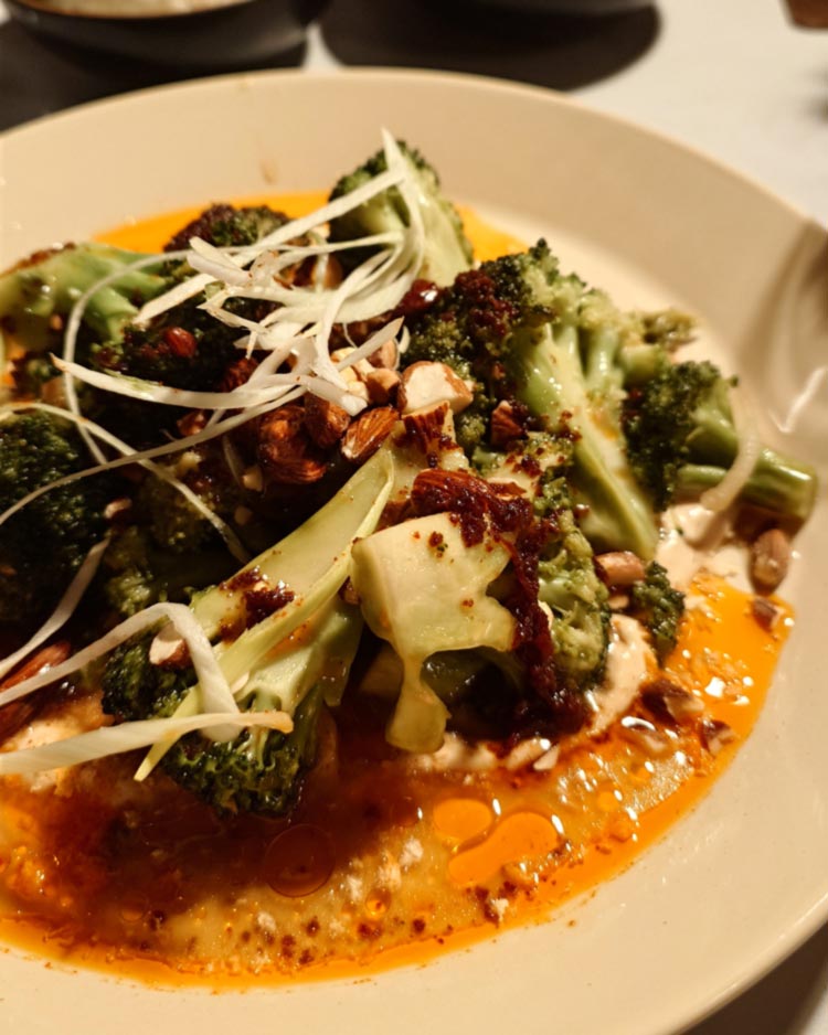Mir war nicht klar, dass sich im Hotel am Brillantengrund mit dem Brilli (1070) ein philippinisches Restaurant versteckt. Dank einer Freundin war ich erstmals dort essen und ziemlich begeistert. Einiges auf der Karte klingt nicht so neu, war aber so dermaßen überraschend und gut gewürzt, dass es mir in Erinnerung bleiben wird. So etwa das Hauptgericht meiner Begleitung, Talong (12€): Melanzani, Sesam, Minze in Kombination hab ich schon hundert Mal gesehen. Die Umsetzung war geschmacklich aber wirklich heraussragend. Ebenso bei meinem meinem Brilli Brokkoli (13€) mit Reis (2€). Er thronte auf süßer Tofucreme mit Chiliöl und gerösteten Mandeln, die Gewürzmischung konnte ich beim besten Willen nicht erschmecken.