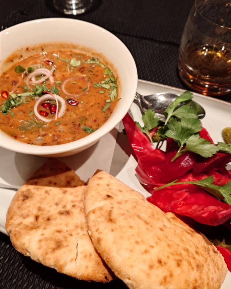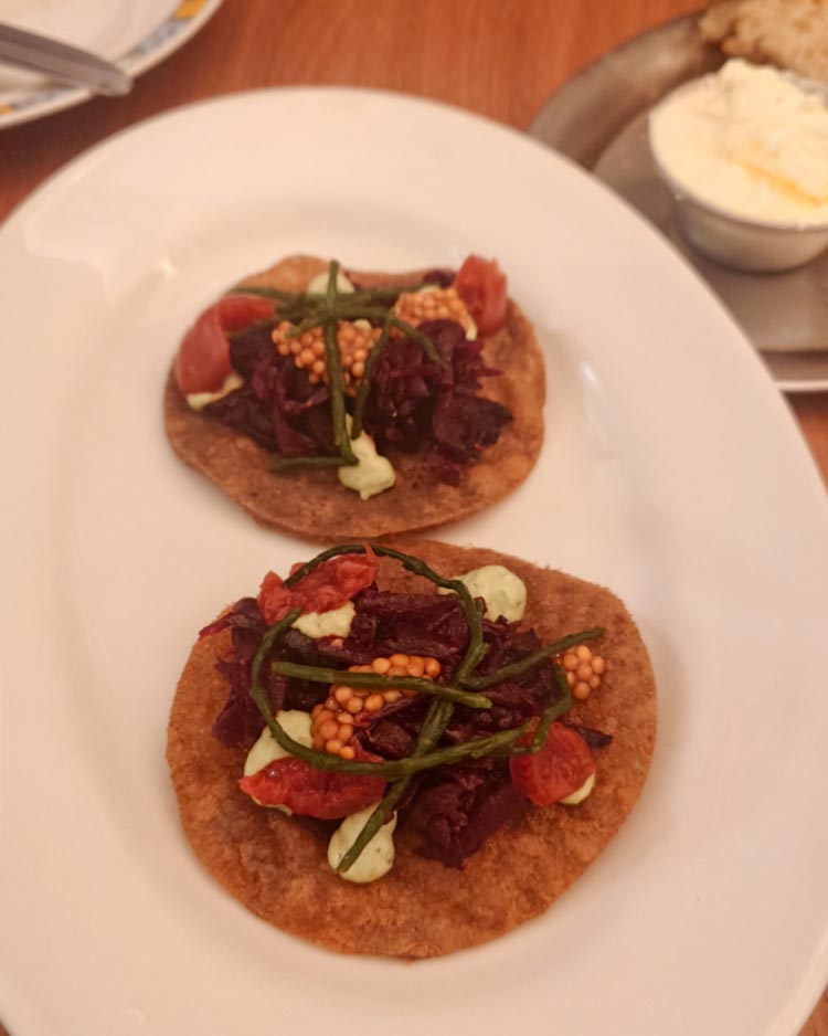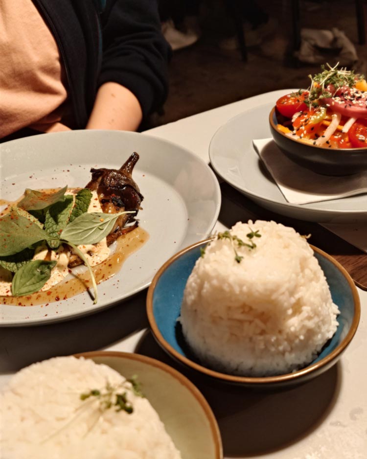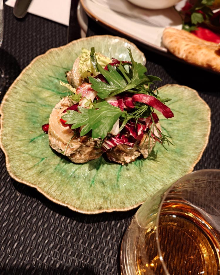 Gefüllte Melanzani-Röllchen mit Walnüssen (6,50€) und Lobio (15€?) im georgischen Café Ansari (1020). Letzteres ist ein recht simpler Bohneneintopf, die Beilagen – eingelegtes Kraut mit roter Bete, viel Petersilie und helles Fladenbrot – brachten diesen aber auf ein neues Level.