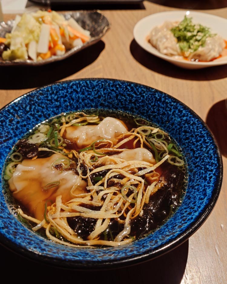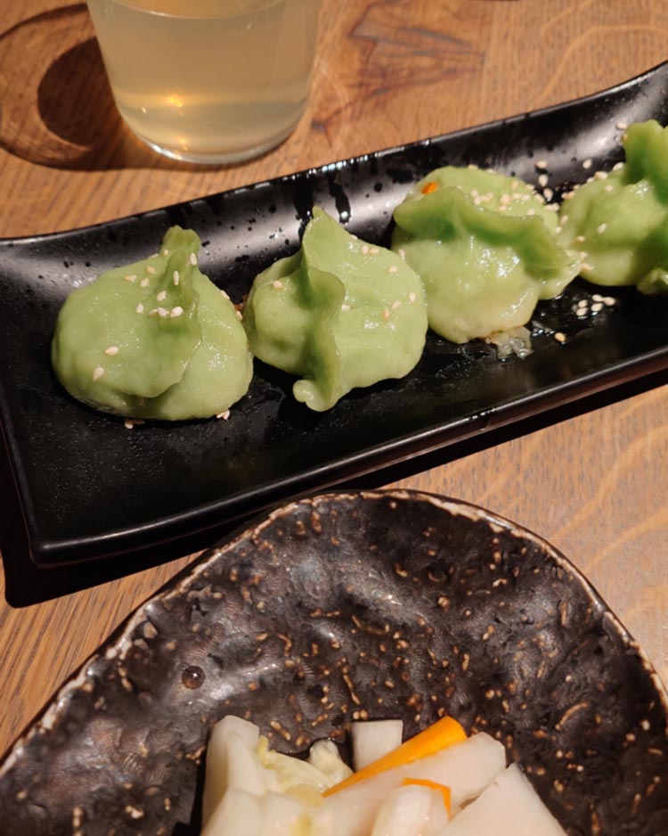 Wan Tan Suppe (6,50€) gefüllt mit Schweinsfaschiertem und je einer Garnele, in der sehr würzigen Brühe war außerdem noch Tofuhaut im Fritatten-Style. Pao Cai Sha La aka Chinese Kimchi (6,50€) stellte sich als süß-sauer eingelegtes knackiges Kraut, Kohlrabi, Judasohr (?) mit saftigen Gojibeeren (?) heraus. Die veganen Jiao Zi (6,90€) mit Glasnudel-Gemüse-Füllung waren ein bisschen fad. Und beim Mango Sticky Reis (8,90€) konnte sich die leicht salzige Kokossauce nicht entscheiden, ob sie warm oder kalt sein sollte.