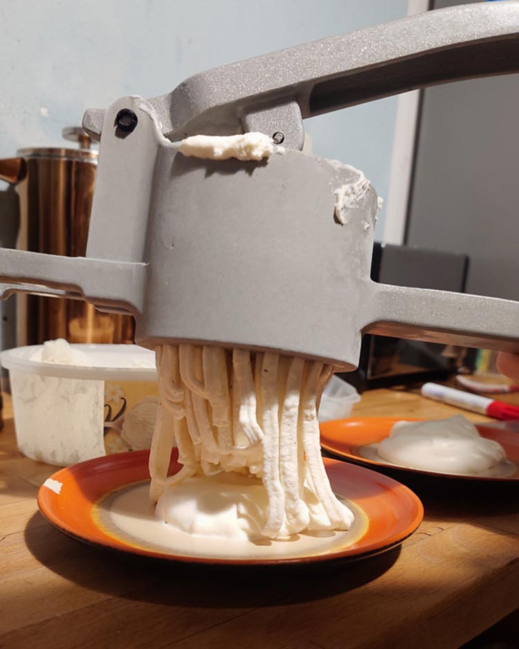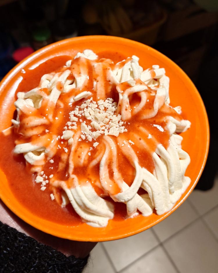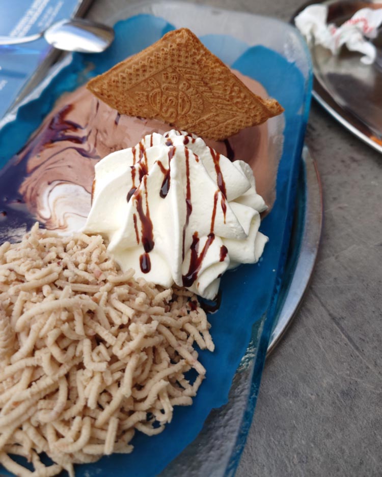 Vanille-Spaghetti-Eis mit Erdbeersauce und gehackter weißer Schokolade bei einer Spaghetti-Eis-Party (was für ein tolles Konzept!). Einen Maroni-Becher (9€?) am Eissalon am Schwedenplatz (1010).