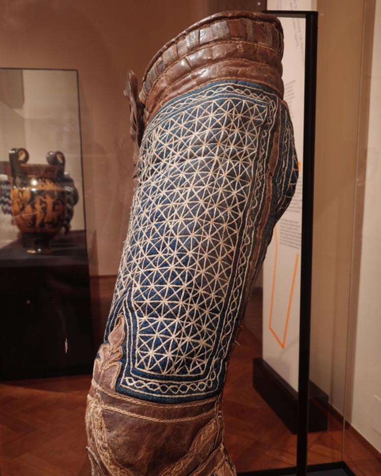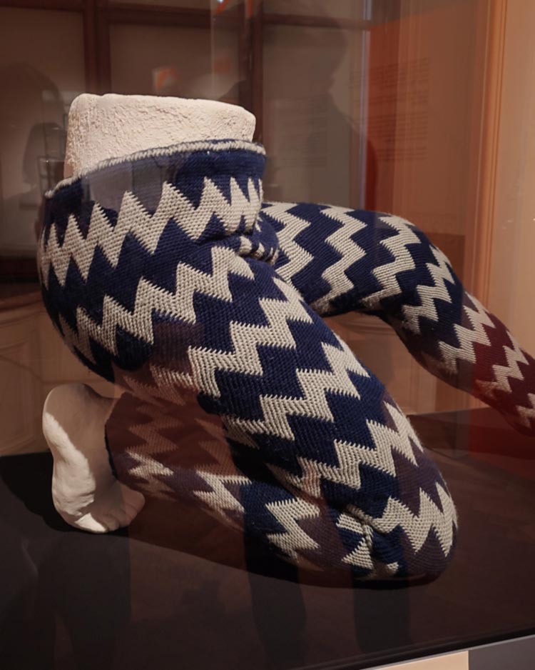 In Wer hat die Hosen an? (noch bis 1.2.26 im Weltmuseum) will ich unbedingt nochmal. Dort sind 3000 Jahre Hosengeschichte ausgestellt, angefangen von einer experimentell-archäologischen Nachbildung der ältesten jemals gefundenen Hose, über Geschlechterstereotype, Unterhosen, bis zu Entwürfen für die Zukunft. Ich pickte einmal wieder nah an den Scheiben, um mir die Verarbeitung der Textilien genau anzuschauen, und war insbesondere von einer antik griechischen Sprang-Geflechtshose und einem irakischen Quiltmodell fasziniert.