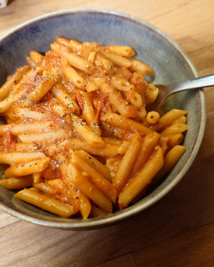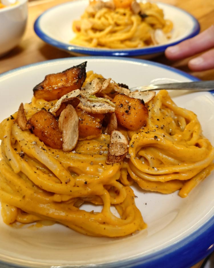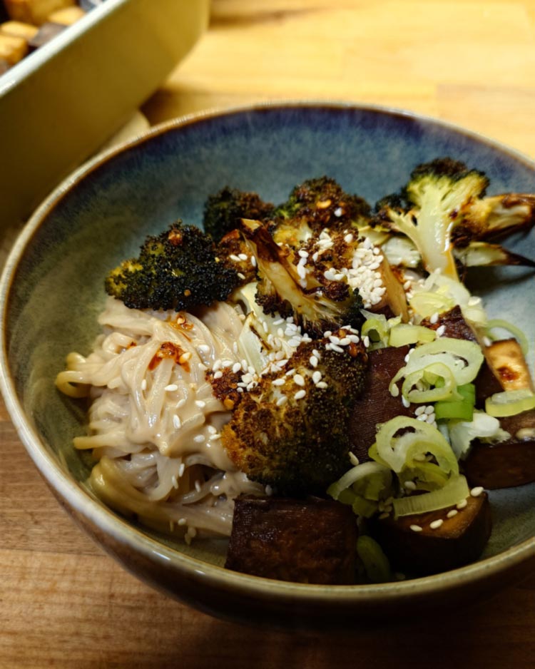 Tagliatelle mit Kürbissauce und frittiertem Knoblauch. Penne alla Vodka mit frischen Tomaten, aber ohne Wodka (sehr lose nach Serious Eats). Reisnudeln mit Sesamsauce (lose nach i am a foodblog), gegrilltem Brokkoli und Tofuwürfeln. Penne mit Gochujang-Butter, Spinat und Erbsen.