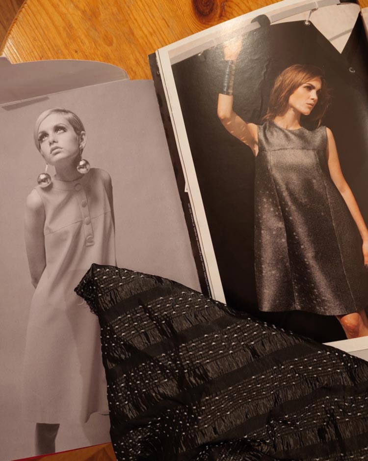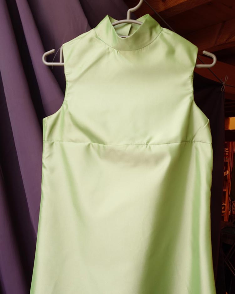 Das Twiggy-Kleid aus Famous Frocks mit veränderter Kragenpartie. Wow, ist es schwierig, einen passenden Stehkragen zu schneidern. Der, den ich jetzt hinbekommen habe, ist weit weg von perfekt sitzend, aber zumindest brauchbar. Meine froschgrüne Version (aus 1,82€-Abverkaufsstoff) ist nur ein Test für das eigentliche Kleid aus anthrazit-schwarz-silbernem Vintage-Stoff aus dem selben Fundus wie der für mein mein Jacqueline Kennedy Onassis Kleid im August (s. Zuckersüß 513)