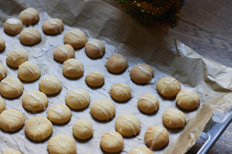 Für den Guss Puderzucker mit etwas Yuzu-Saft zu einem dicken Guss anrühren. Mit einem Löffel in dünnen, wilden Linien auf der Oberfläche der Kekse verteilen.