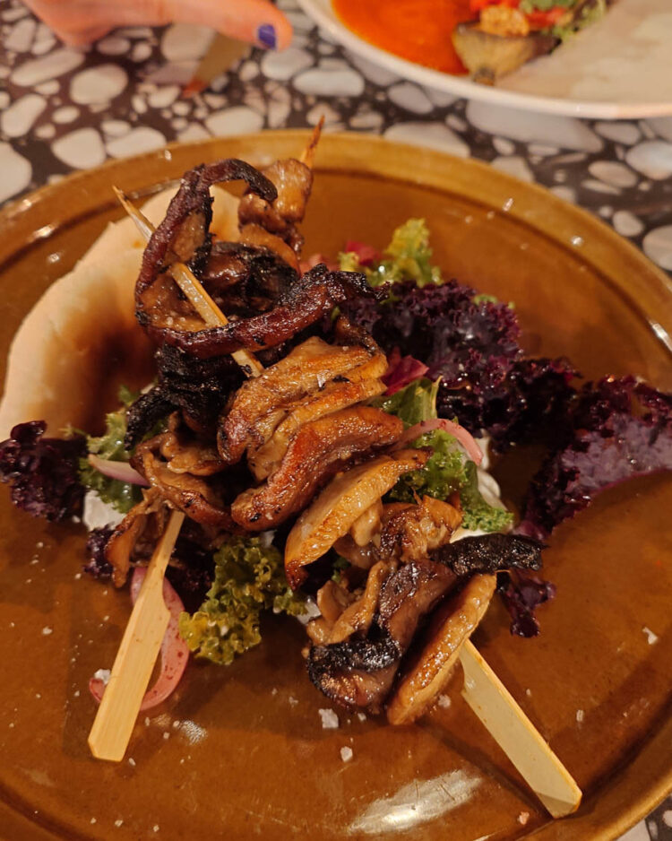 Einige Teller im sehr hübschen &Flora im Hotel Gilbert (1080), in das ich schon ewig mal wollte. Absoluter Favorit: Die Pilzspieße „shish Kabab style“ (24€), rauchig, leicht süß-würzig mariniert, fleischig in der Konsistenz, dazu frischer Joghurt, knackiger Kohl und ein Minipita.
