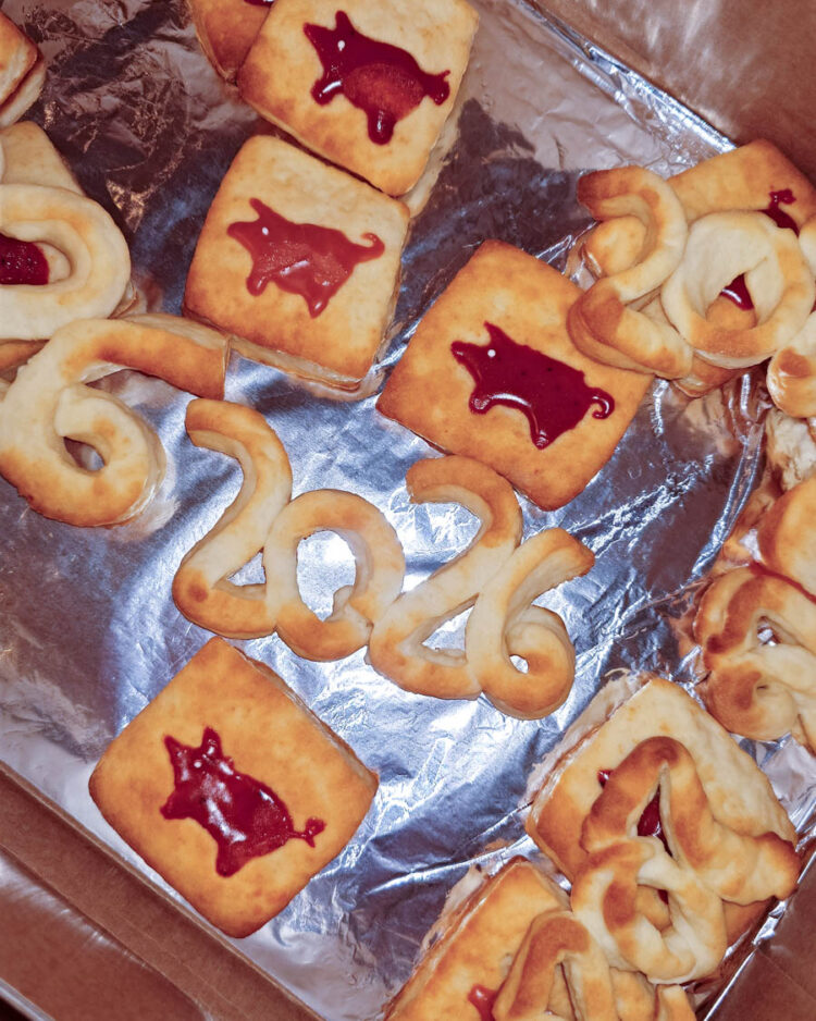 Seit dem letzten Zuckersüß habe ich leicht creepy Glücksschwein-Kekse und 2026-Jahreszahlen (nach dem Rezept für Quark-Schmetterlinge von 2010) und Zimtschnecken (nach diesem Rezept von Bravetart von 2017) gebacken. Außerdem habe ich Tiramisu gemacht, mit Karamell/Biscoff-Keksen statt Löffelbiskuits (lose nach dem Rezept für Lebkuchenhaus-Tiramisu von 2016). Und dann habe ich noch angefangen, Plunderteig zu machen, für eine Galette des Rois.