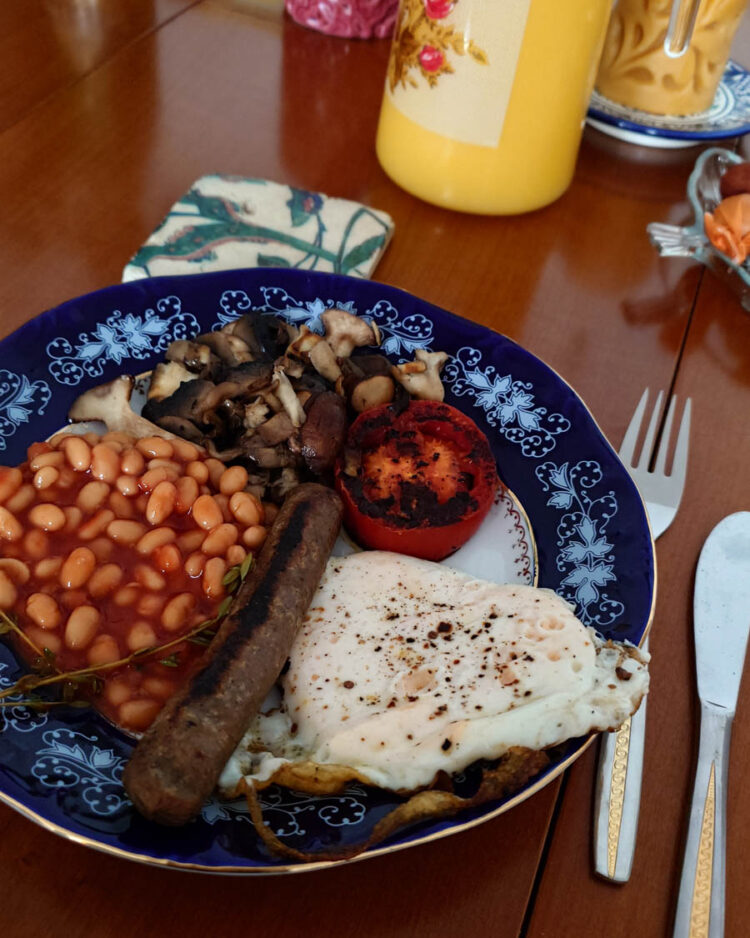 Kaiserschmarrn. Käsebrot. Veggie-Lasagne. Ein vegetarisches full English Breakfast zu Neujahr, beim besten aller Nachbarn.