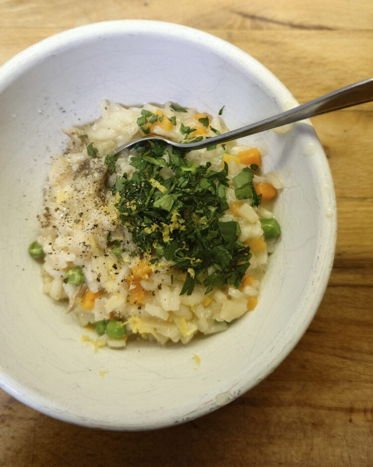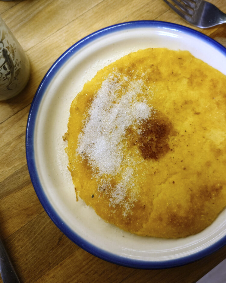 Buttermilch-Kaiserschmarrn. Pizza Margherita von meinem Mitbewohner. Risotto mit Karotten, Erbsen und allerlei getrockneten Schwammerln. Polenta-Pfannkuchen mit VIEL Zucker.