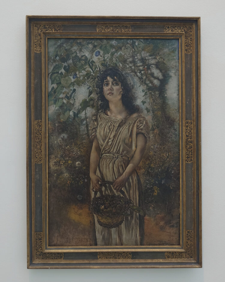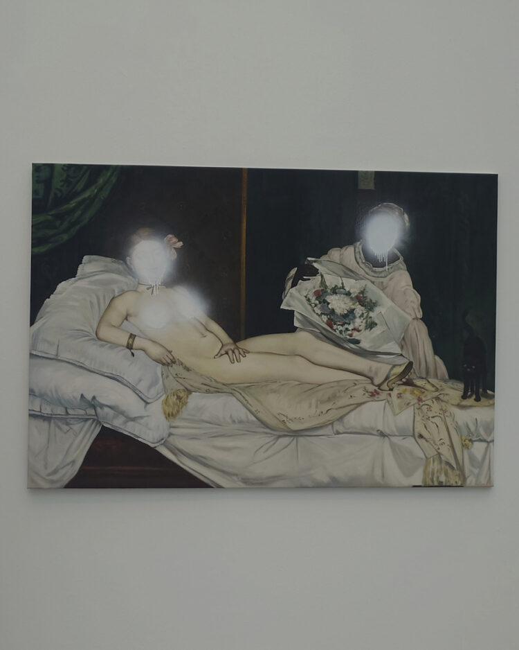 In Mädchen* sein!? Vom Tafelbild zu Social Media (noch bis 6. April) im Obergeschoss schaute ich dann auch noch. Einige der historischen Schinken dort fand ich unangenehm anzuschauen, weil sie so sexualisiert wirkten – z.B. das Mädchen mit Nusskorb von Anton Romako (1880). Die mit weißer Farbe übersprühten Gesischter auf dem Bild Olympia (2024) des französischen Kollektivs Claire Fontaine las ich als Kommentar genau darauf.
