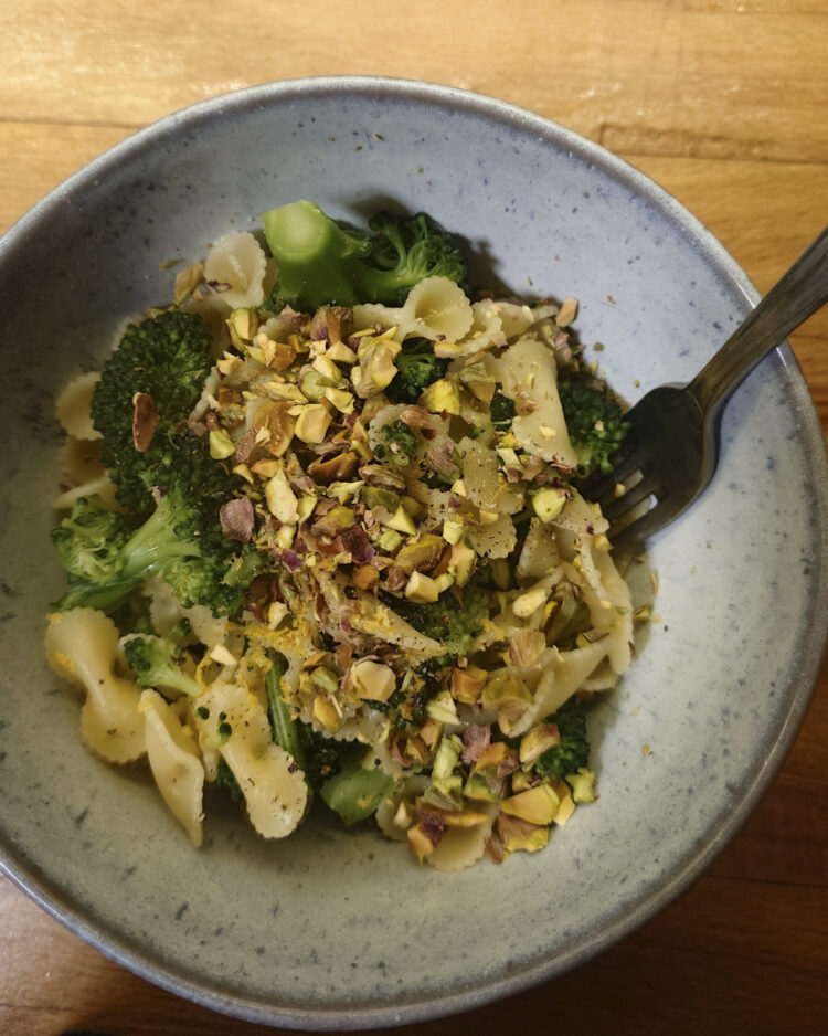 Fenchel und weiße Bohnen aus dem Ofen, mit Zitrone, Knoblauch und Petersilie. Tagliatelle und Veggie-Ragu. Pasta mit Brokkoli, Pistazie und Zitronenzeste. Germknödel mit Vanillesauce.