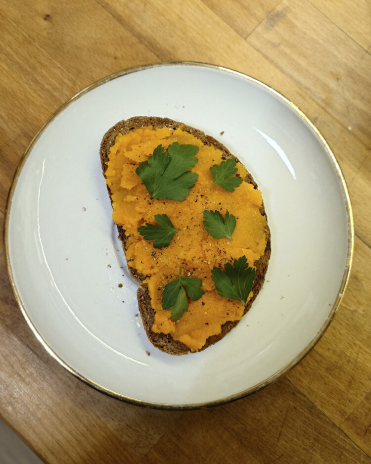 Ein Brot mit Karottenpüree und Petersilie. Ein Omlett mit selbstgesammelten Frühlingskräutern (Brennessel, Löwenzahn, Giersch, Bärlauch, Spitzwegerich), dazu Reis und Topfen-Joghurt.