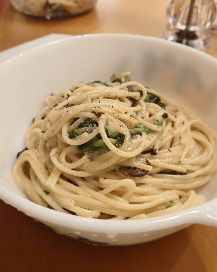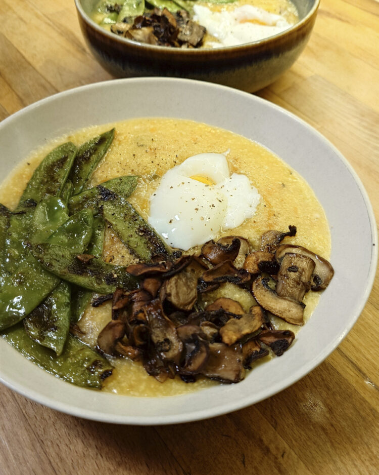 Risotto mit Brokkoli und Zuckererbsen-Garnitur. Polenta-„Suppe“ mit Onsen-Ei, gebratenen Champignons und Zuckererbsen. Spaghetti mit Austernseitlingen und Spinat-Sahne-Sauce. Kartoffelpuffer auf Koreanisch, dazu Kimchi (angelehnt an dieses NYT-Rezept). Spaghetti mit Tomatensauce.