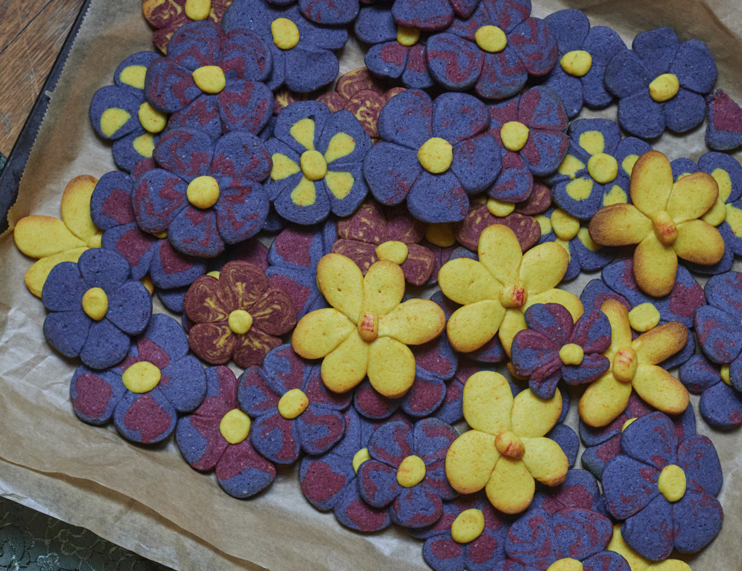 Als Grundlage nahm ich meinen hundertfach bewährten Knetteig (s. z.B. Safran-Plätzerl zu Ostern, Rosen-Mürbteigkekse, Kirschblatt- und Brombeerblatt-Butterkekse) und färbte ihn ein.
