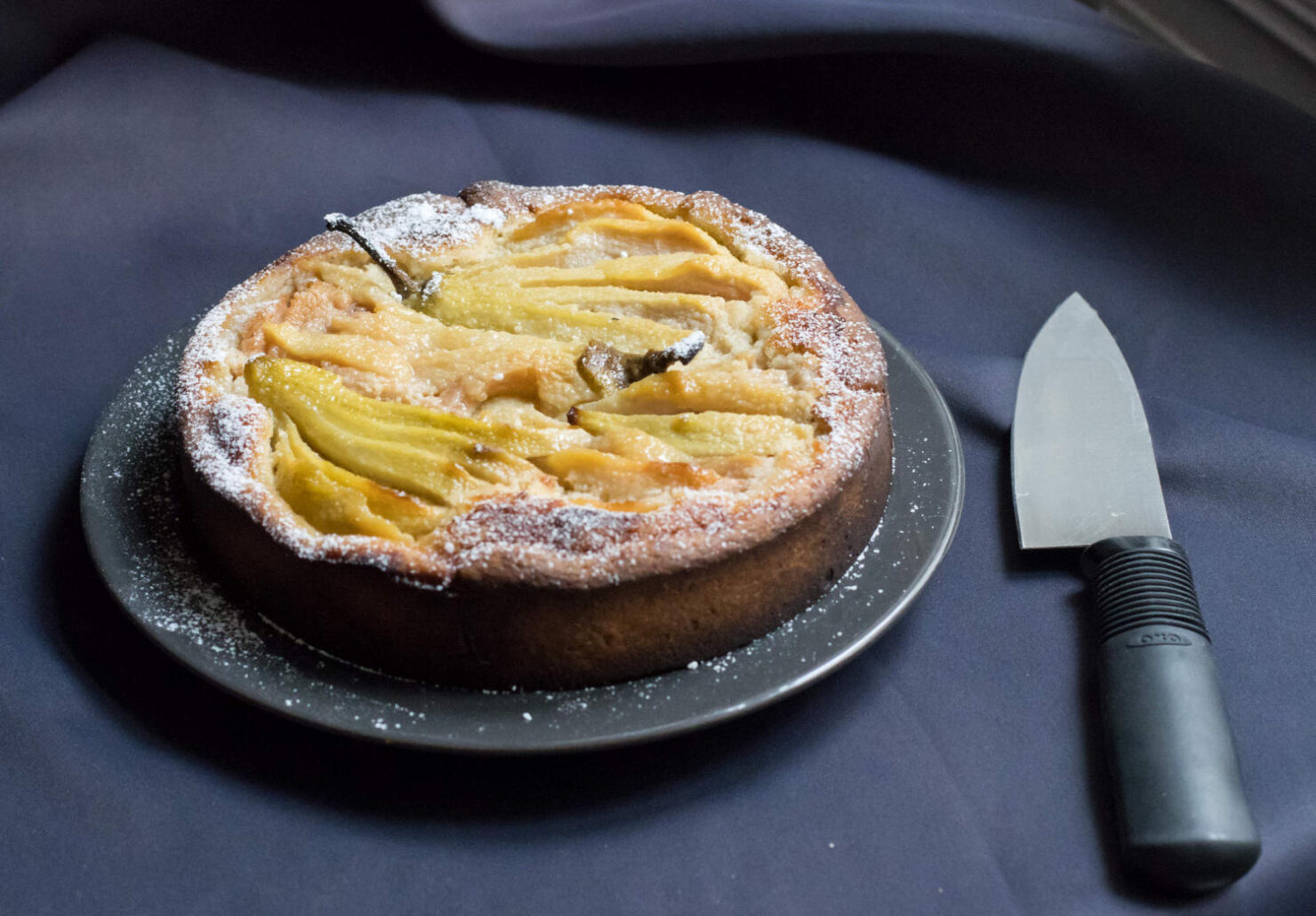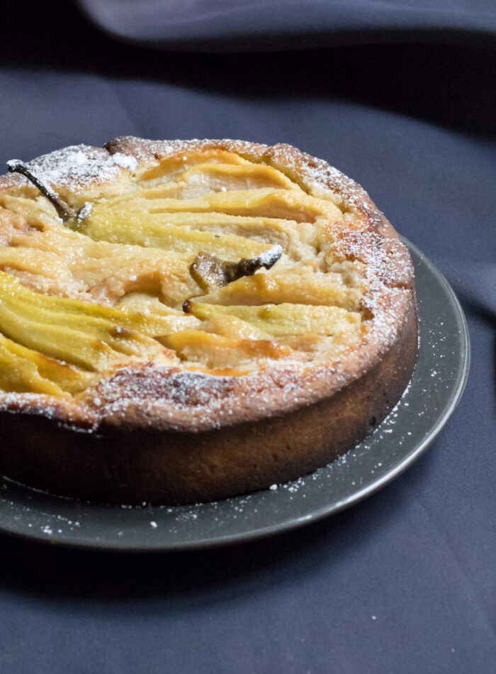 Mandeltarte mit pochierten Safranbirnen