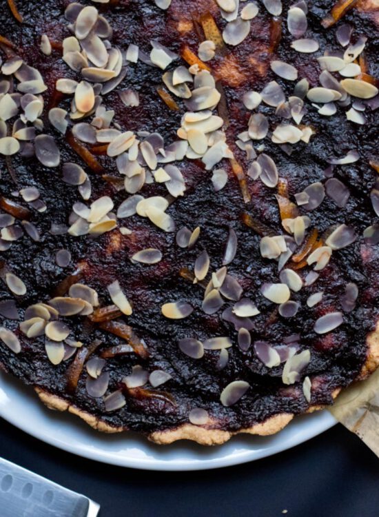 Mürber Mandelkuchen mit Zwetschgen und kandierten Orangen